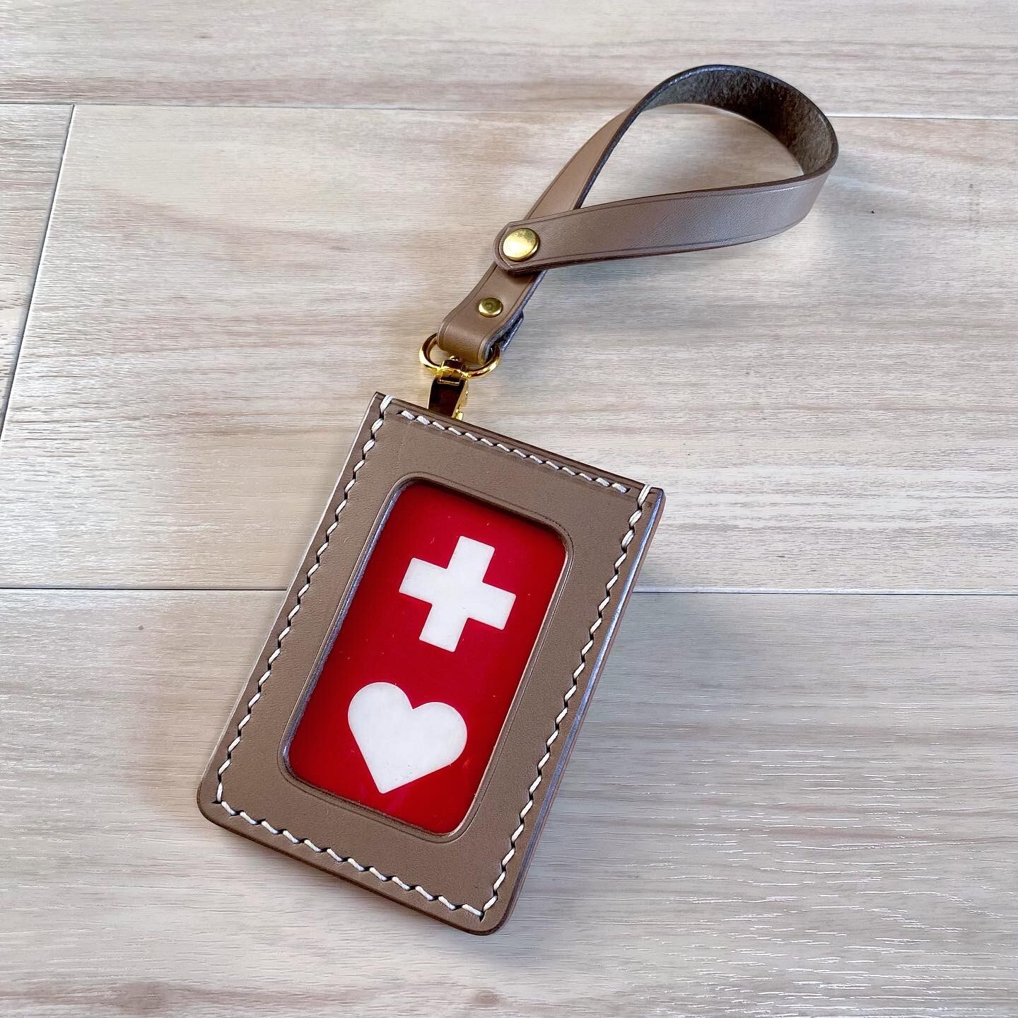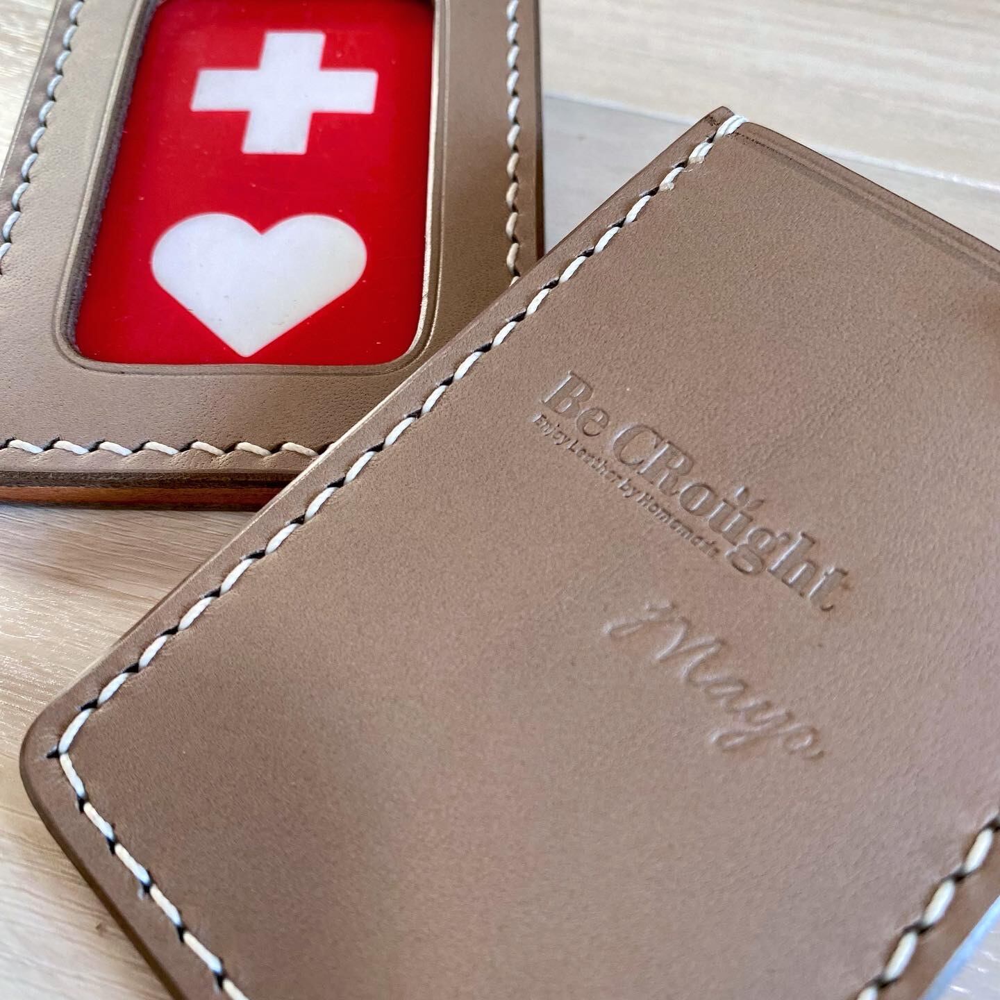 地方によっても若干の差がありますが、ヘルプマークはある程度の厚みがあるので、厚革の「枠」を挟んで外革を縫い合わせることで、マークがすっぽりと収まるようスペースを設けてお作りしてあります。