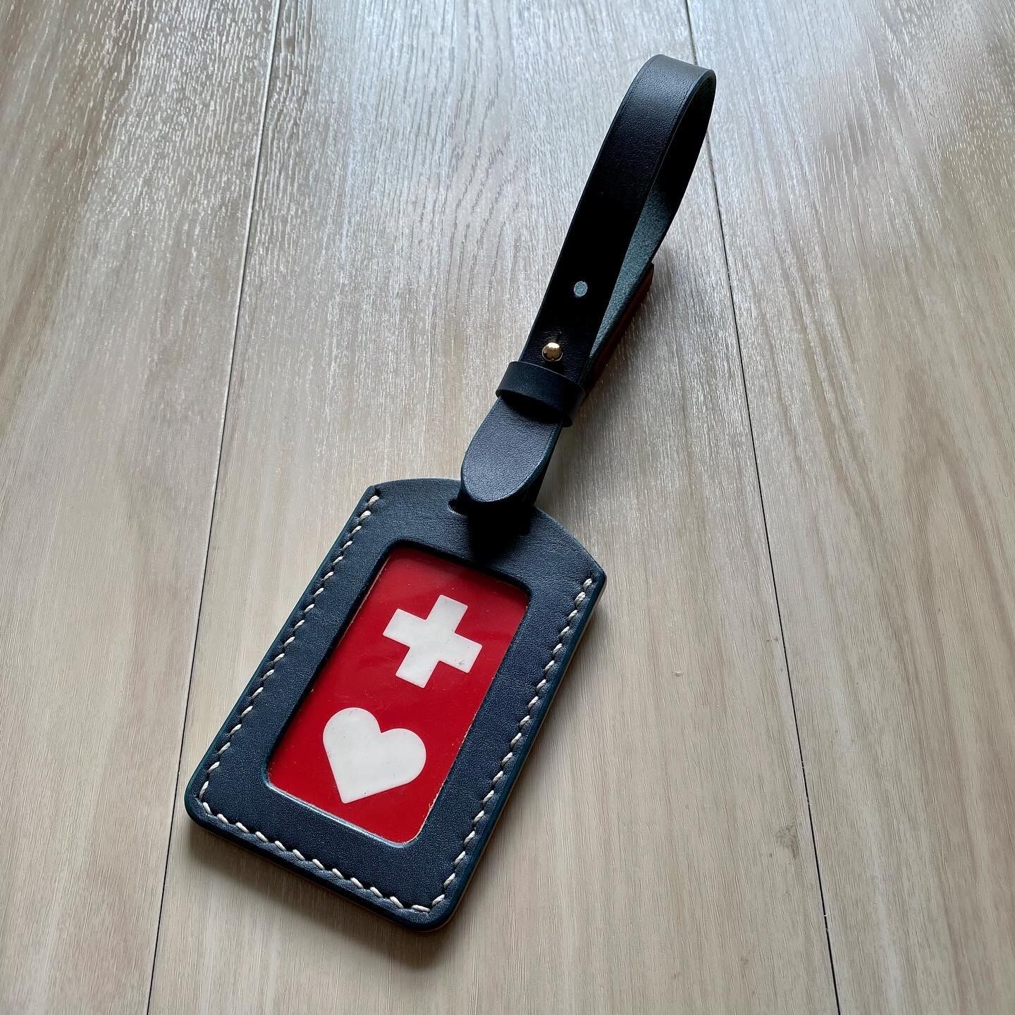 地方によっても若干の差がありますが、ヘルプマークはある程度の厚みがあるので、厚革の「枠」を挟んで外革を縫い合わせることで、マークがすっぽりと収まるようスペースを設けてお作りしてあります。